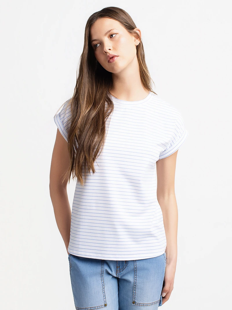 Short-sleeved t-shirt with a horizontal stripe pattern. It features a straight cut, hip-length, a rounded neckline, and short sleeves with sewn cuffs.