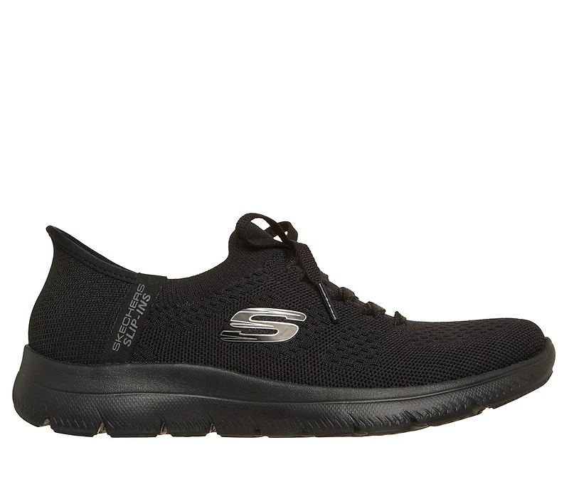 STEP IN AND GO™ Pick up the pace with increased ease-of-wear and platinum comfort wearing Skechers Hands Free Slip-ins®: Summits - New Daily. Designed with our Heel Pillow®, this vegan style features a Stretch Fit® engineered knit upper with fixed laces, metallic midsole trim and a cushioned Skechers Air-Cooled Memory Foam® comfort insole.