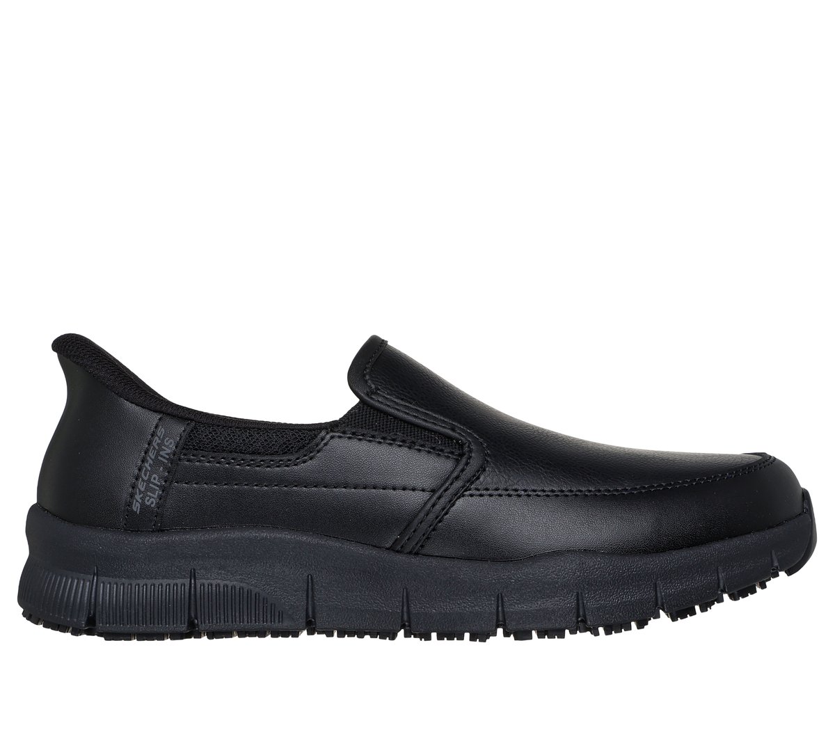 Step into work with surefooted comfort and safety wearing Skechers Hands Free Slip-ins® Work™: Nampa - Engus. Designed with our Heel Pillow®, this slip-on style features a smooth leather and synthetic upper with twin-gore panels for ease of wear, a cushioned Skechers Air-Cooled Memory Foam® insole, and a slip-resistant outsole.