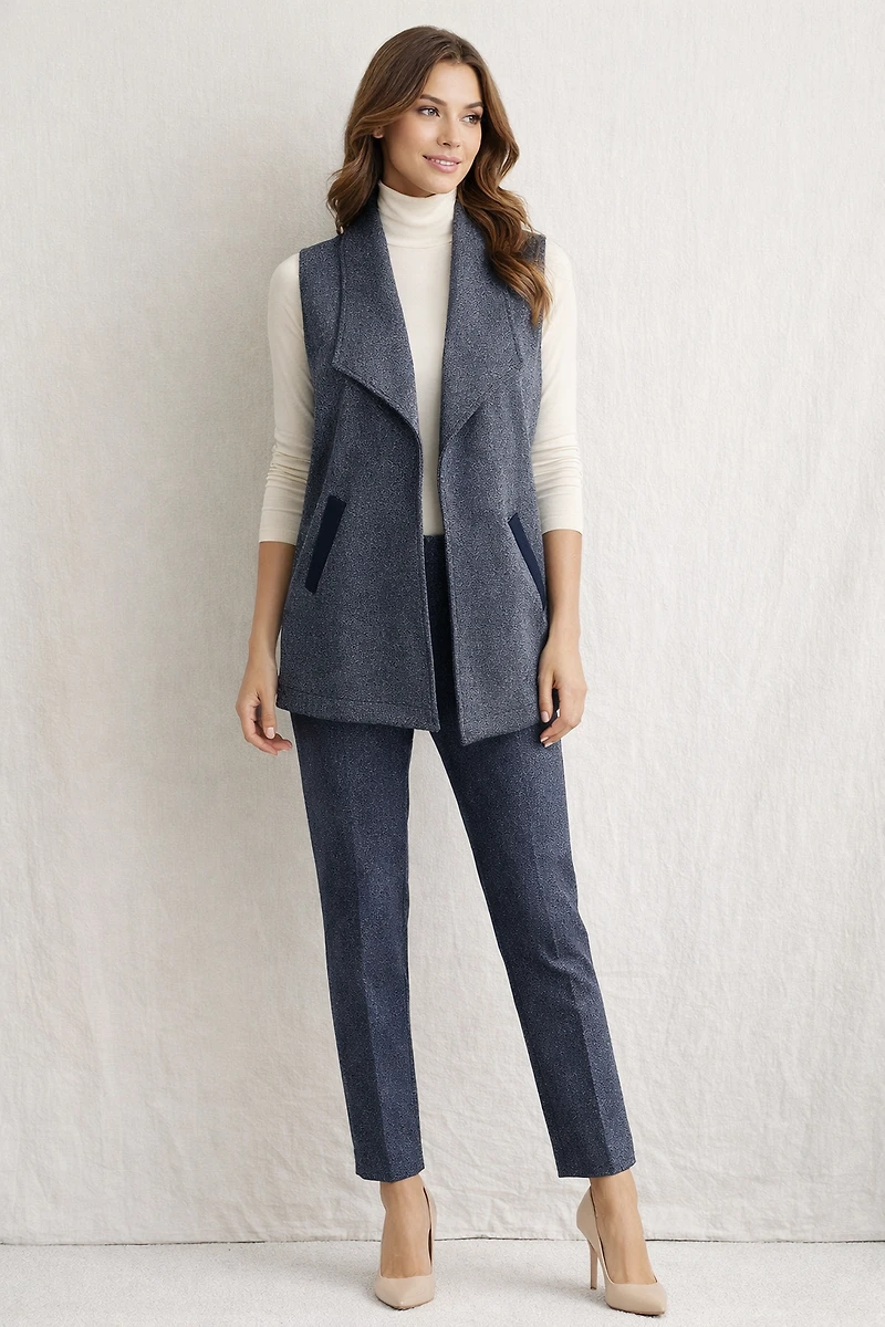Two-tone sleeveless knit jacket with slanted front pockets and side slits. Worn open (no fasteners or buttons). Pairs well with pants style #73423P - Brand: Modes Vin Rouge