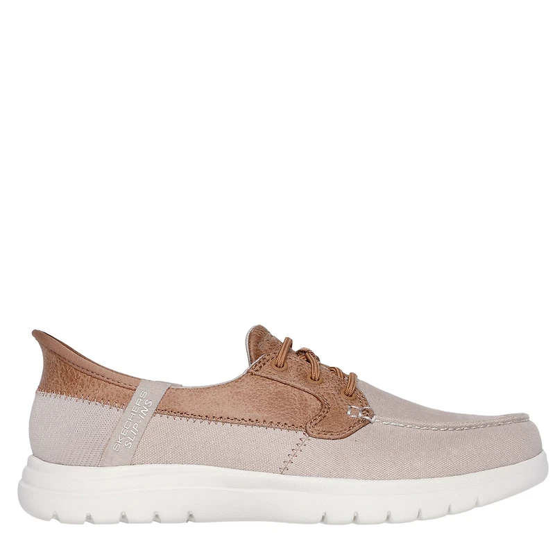 Slip into practical, well-cushioned nautical comfort with the Skechers Hands Free Slip-ins® On-The-GO® Flex – Palmilla. This casual boat shoe features a canvas and vegan leather upper, our Heel Pillow®, a Skechers Air-Cooled Memory Foam® insole, lightweight ULTRA GO® cushioning, and a molded heel counter for hands-free slip-on convenience.