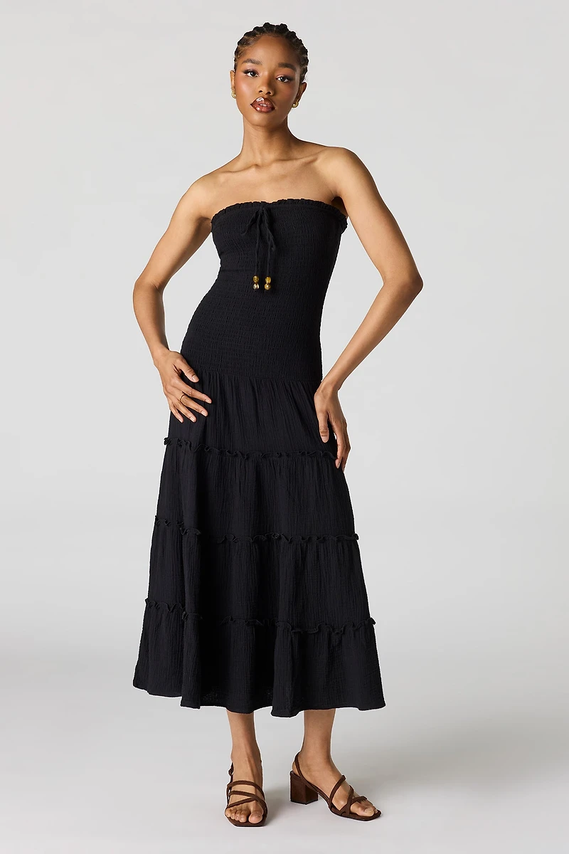 This dress features smocked material, front ties, tube neckline, tiering and midi length.