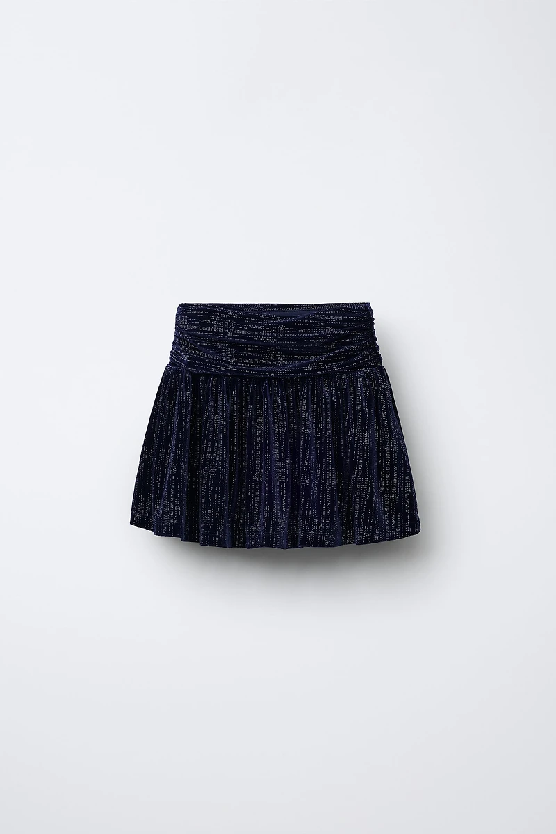 Velvet skirt with elastic waistband and pleat detail. Sparkly detail.
