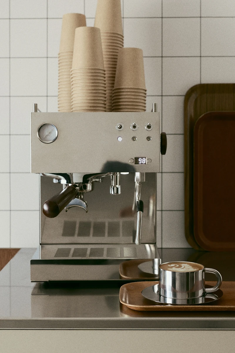 Cup and saucer in stainless steel with a timeless design. Stackable for easy storage.