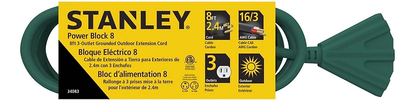 Engineered for outdoor use, this extension cord spans an impressive 8 feet, extending your power access. The three grounded outlets provide ample connectivity for various devices. The 16/3 SJTW vinyl cord is not only durable but also offers flexibility, accommodating different setups. With a dependable rating of 125V/13A/1625W, it handles diverse electronics and tools. The cord's CUL safety certification reinforces its compliance with rigorous safety standards, ensuring secure usage. Designed for convenience and functionality, this outdoor extension cord delivers power and peace of mind, making it an essential addition to your outdoor activities and projects.