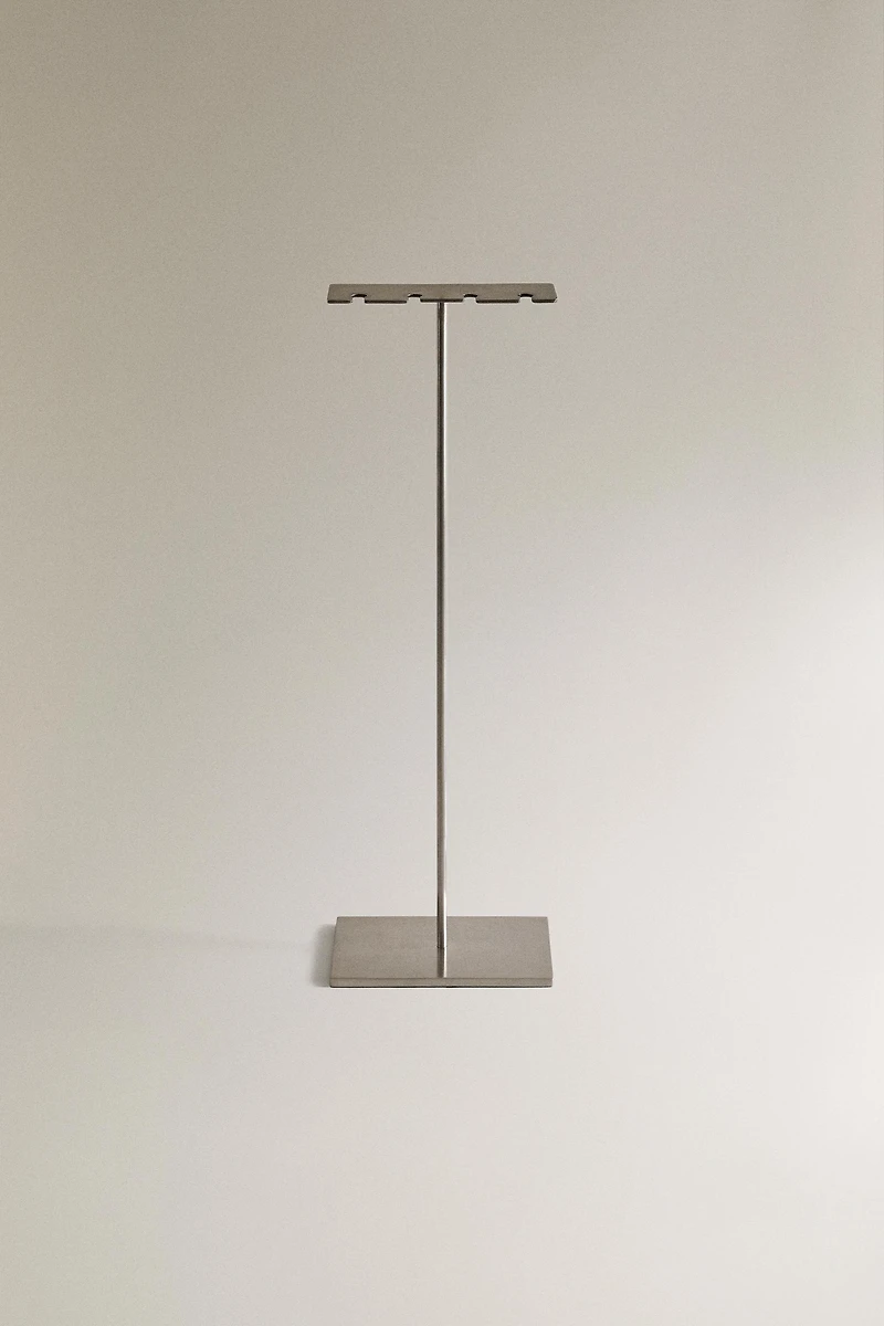 Steel stand with a square base for hanging fireplace accessories. It has four upper slots for placement.