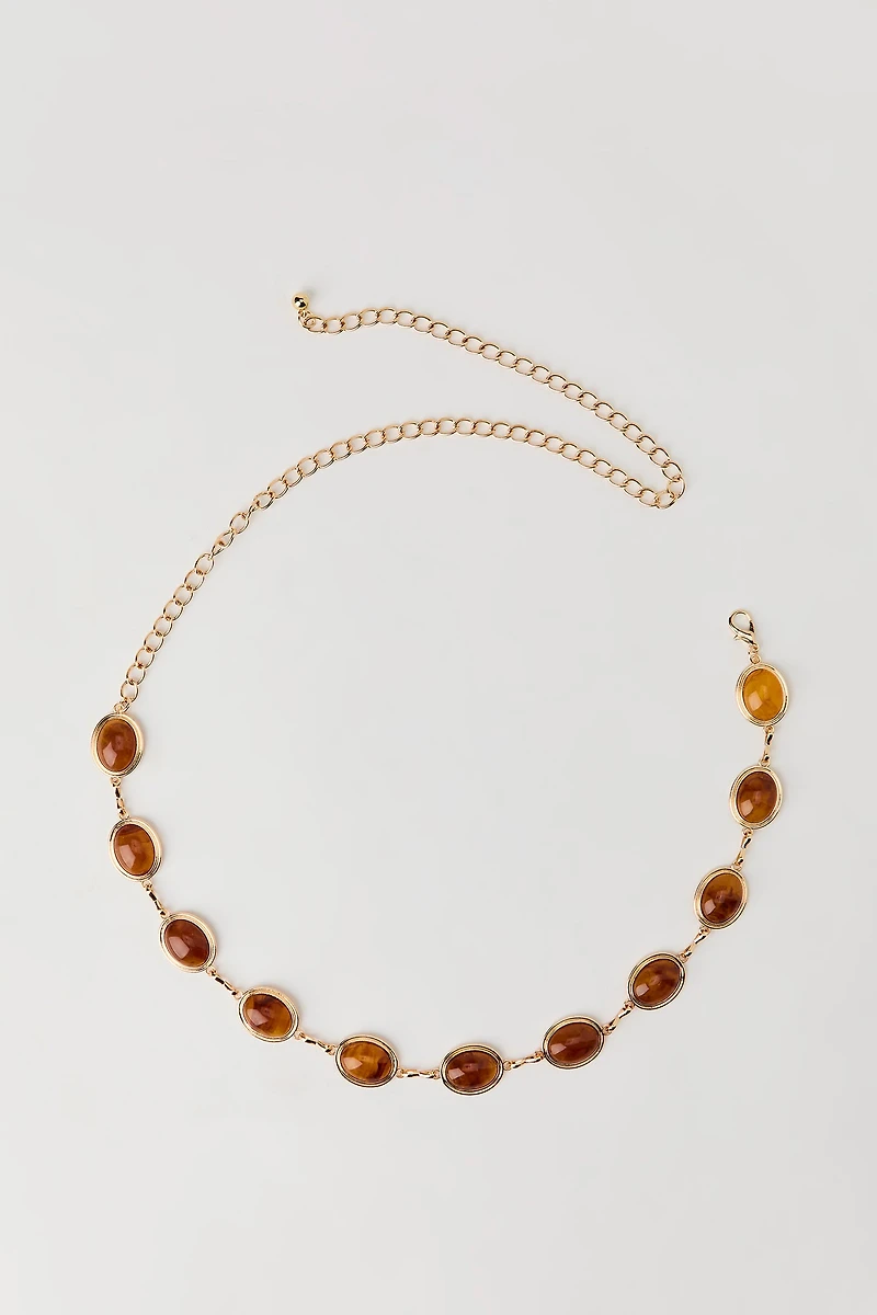 This belt features stone details, chain link, and adjustable lobster clasp closure.