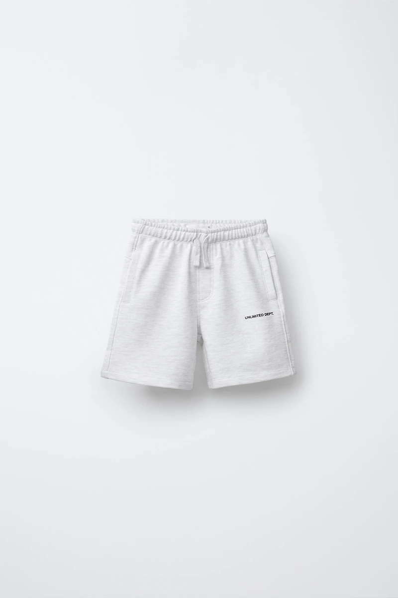 Straight fit Bermuda shorts with a short length, elastic waistband and adjustable front drawstrings. Front pockets with trim detail. Embossed text detail on leg. Fabric with 60% cotton.