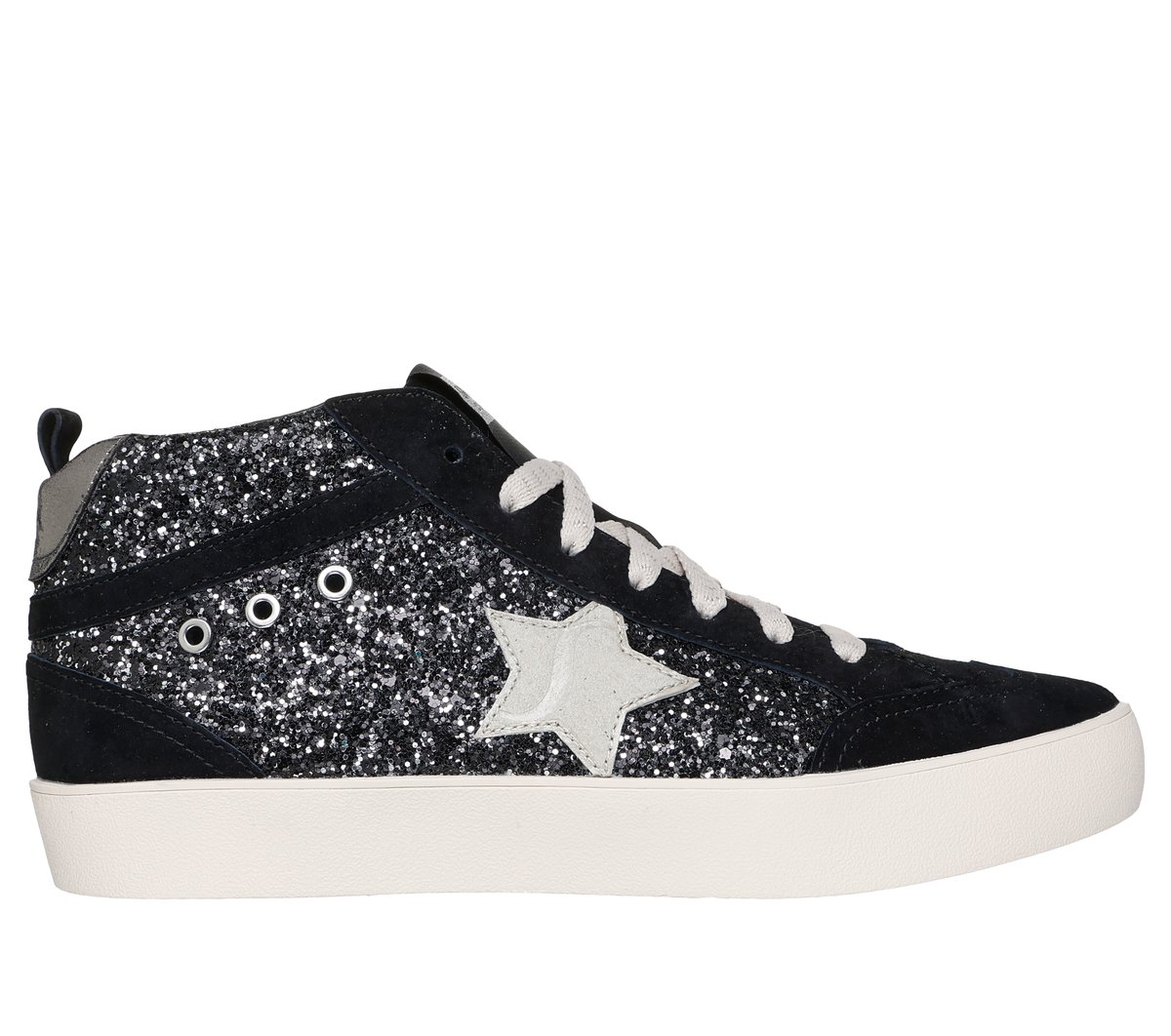Find your star power style with uncompromising comfort wearing Skechers Strand Star - Golden Glam. This mid-top fashion sneaker features a rock glitter and suede overlay upper with a hidden wedge court-style midsole, lace-up front, star patch quarter detail, and a Skechers Air-Cooled Memory Foam® cushioned insole.