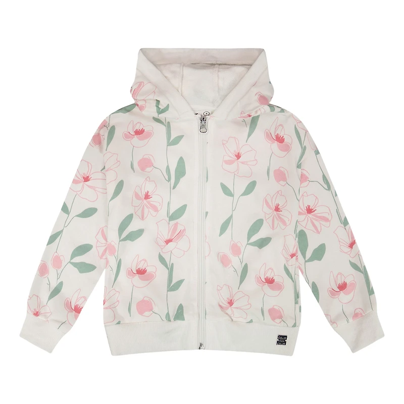 The French terry hoodie in off white with printed flowers is a cozy yet stylish layer for spring days. This sweatshirt features a practical full zip front, an attached hood, and ribbed trims that ensure comfort and flexibility. Made from soft cotton French terry with a hint of stretch, it is perfect for completing any outfit from the “Under My Straw Hat” collection.Features: -Long-sleeve cardigan -Attached hood -Full-length zipper -Allover print -Machine wash in cold water, tumble dry on low heat, do not bleach, keep away from fire Fabric: 95% Cotton / 5% Elastane