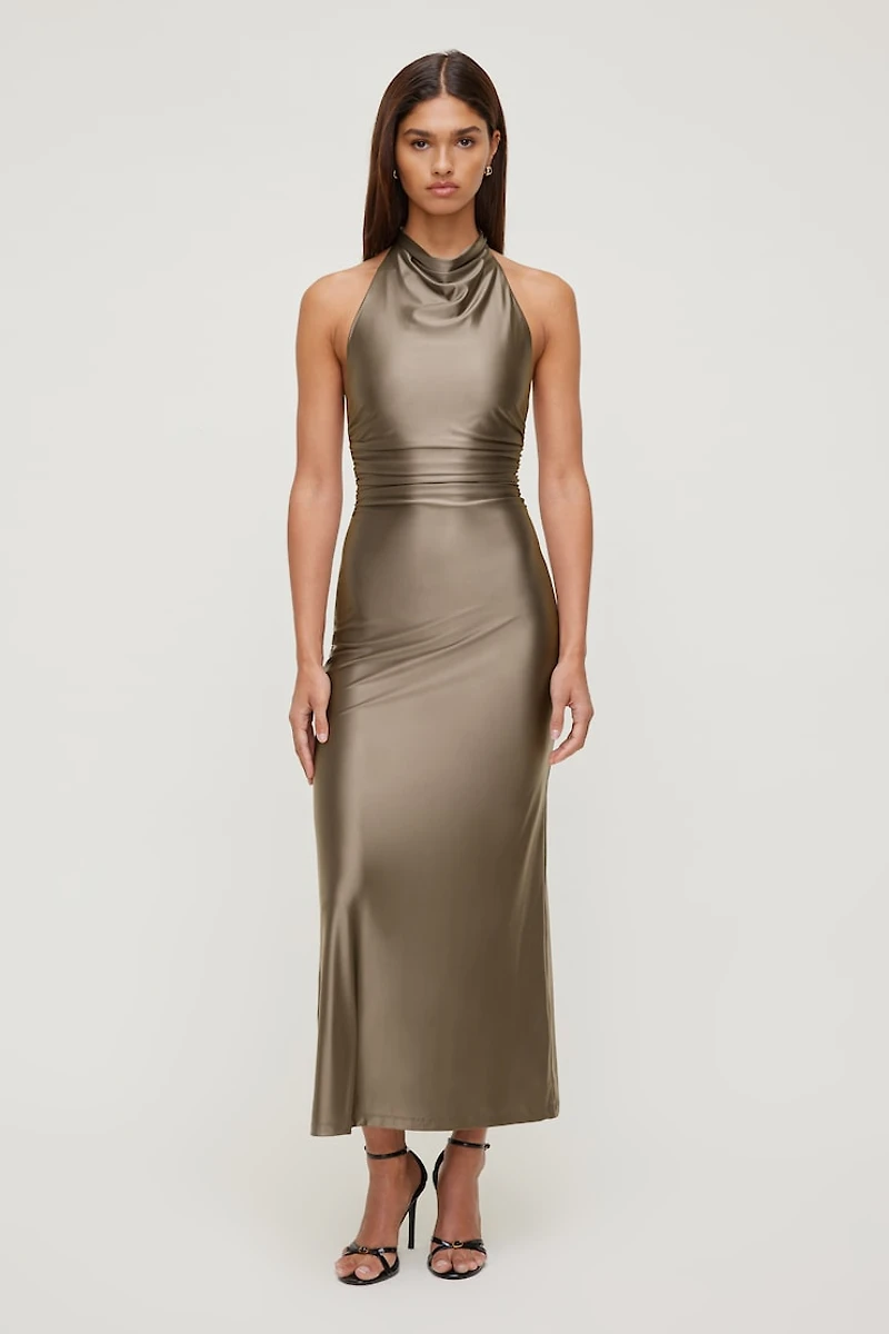 This maxi dress is made from a stretchy knit fabric with a glazed satin finish and a smooth, body-hugging feel. It's designed for a bodycon fit throughout the bodice with a flouncy column skirt that gives a sexy, flirty feel. This lustrous dress makes for the perfect going out look.