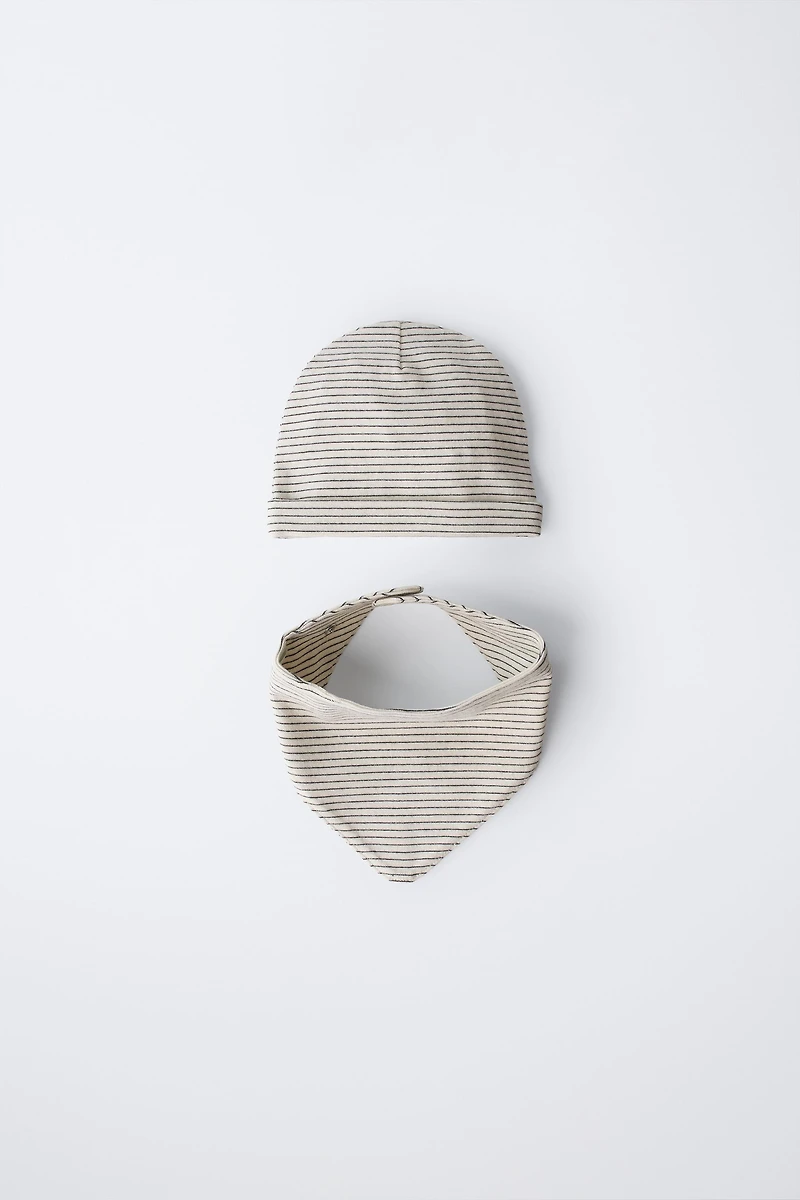 Two-piece set. Hat with cuffed hem. Bib with adjustable snap button closure at the nape.