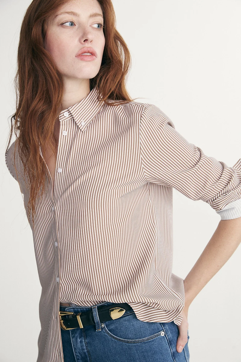 This striped shirt is a true everyday staple. With its fluid fit and clean design, it easily suits any occasion, from workdays to casual outings. A versatile piece that is both modern and easy to style.