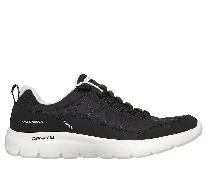 Stitch cloud-like comfort into your everyday style with Skechers Summits Contour Foam™ - Cozy Fit®. This casual easy-on style features a quilted mesh, leather, and duraleather upper with tied-off stretch laces, Contour Foam™ midsole cushioning, and our signature cushioned Skechers Air-Cooled Memory Foam® insole.