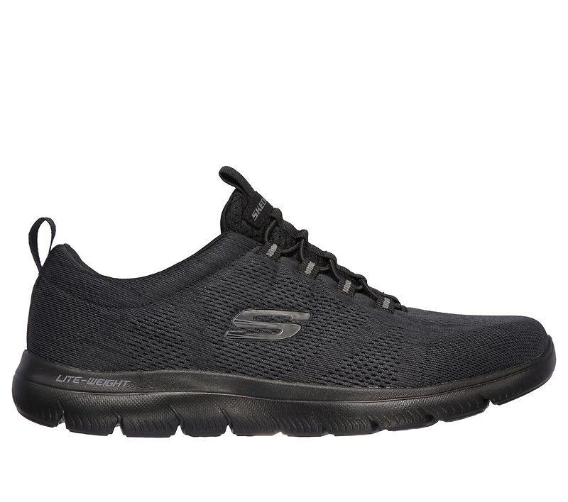 Sleek, soft style harmonizes with cushioned comfort in the SKECHERS Summits - Louvin shoe. Engineered mesh fabric nearly one piece upper in a bungee laced slip on athletic training sneaker with woven-in accents. Memory Foam insole.