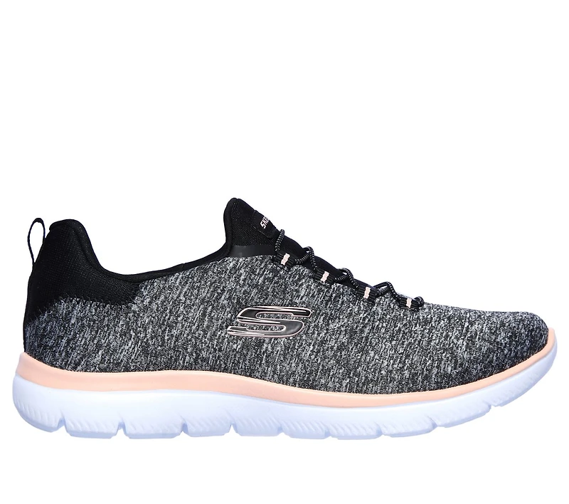 Get right to the sporty style and comfort wearing the SKECHERS Summits - Quick Getaway shoe. Nearly one piece soft heathered jersey knit mesh fabric upper in a bungee laced slip on athletic training sneaker with stitching accents. Memory Foam insole.