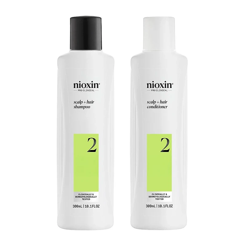 Nioxin System 2 Duo is designed for natural hair experiencing advanced thinning. This routine helps cleanse the scalp, remove impurities and improve the appearance of hair density. Used together, the shampoo and conditioner support a healthier scalp environment while leaving hair stronger, thicker and fuller. Helps improve the appearance of hair density Cleanses and balances the scalp Routine designed for natural hair with advanced thinning BOX CONTENT System 2 Shampoo System 2 Conditioner HOW TO USE Apply the shampoo to wet hair and massage into the scalp to create a lather, then rinse thoroughly. Follow with the conditioner on the scalp and lengths, leave on for a few minutes and rinse.