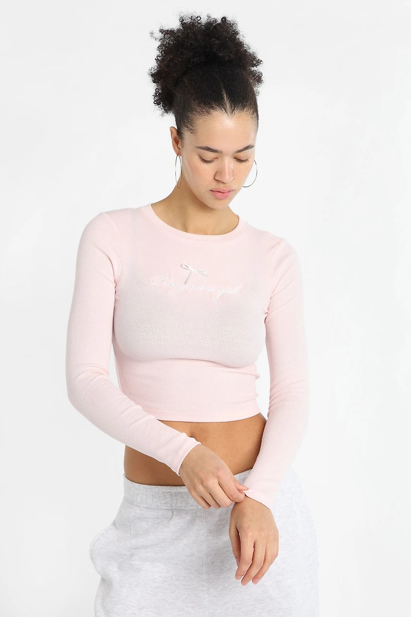 Tricot côteléManches longuesCol ras du couCoupe courte et ajustéeTexte « I'm just a girl » brodé sur la poitrine avec un noeud 3D en satin95% Coton, 5% SpandexLaver à l'envers - Machine à l'eau froide - Cycle délicat avec couleurs similaires - Sans eau de javel - Séchage en machine à basse température - Repassage à basse température sur l'enversImportéArticle #0550-25432612