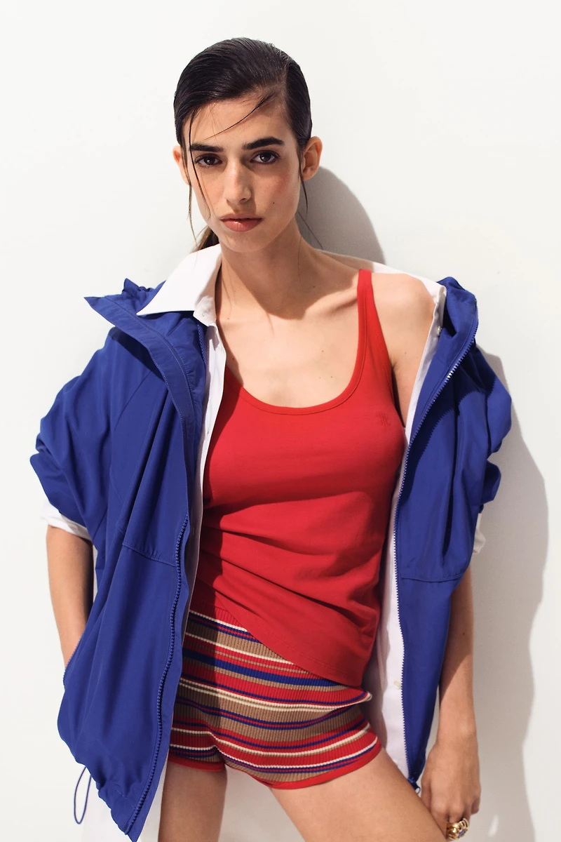 Fitted tank top in cotton jersey. Narrow shoulder straps, scoop neck at front and back, and an embroidered detail at front.