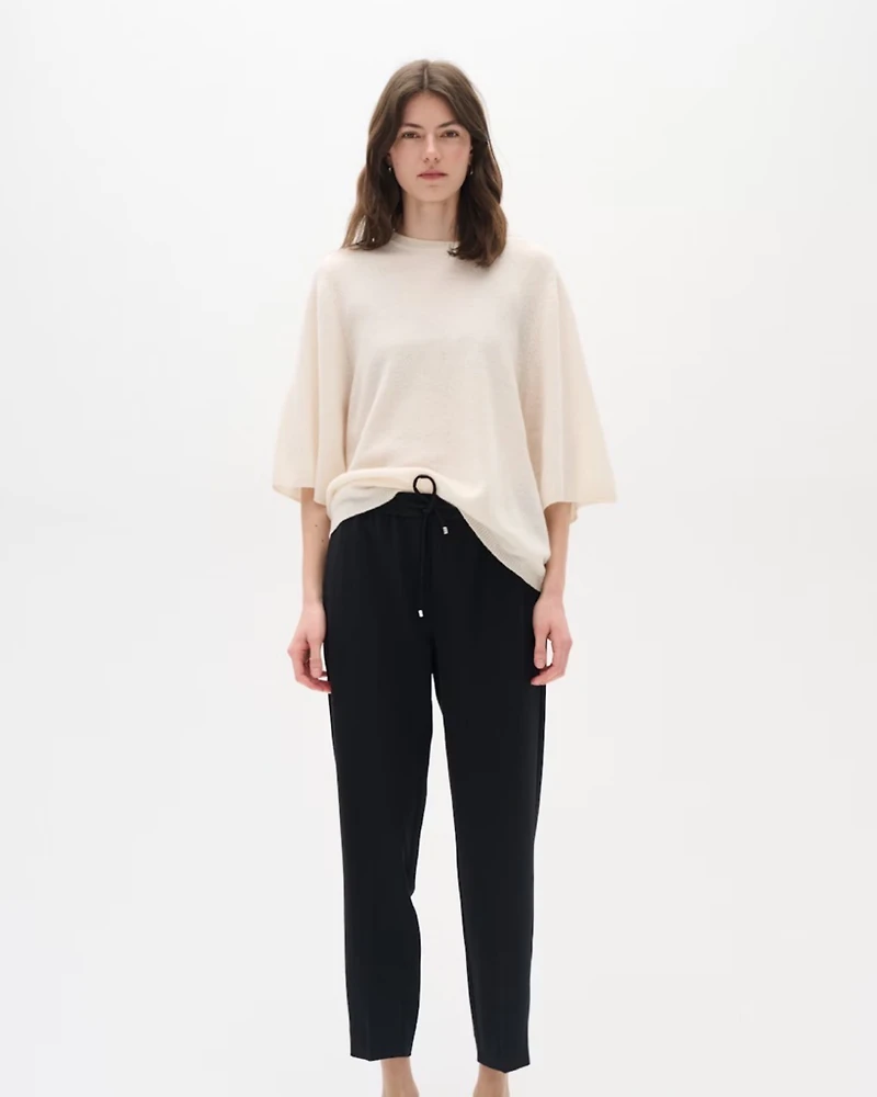 Tapered trousers feature a clean silhouette with an elastic waistband and adjustable drawstring. Soft, fluid texture offers effortless style and ease.