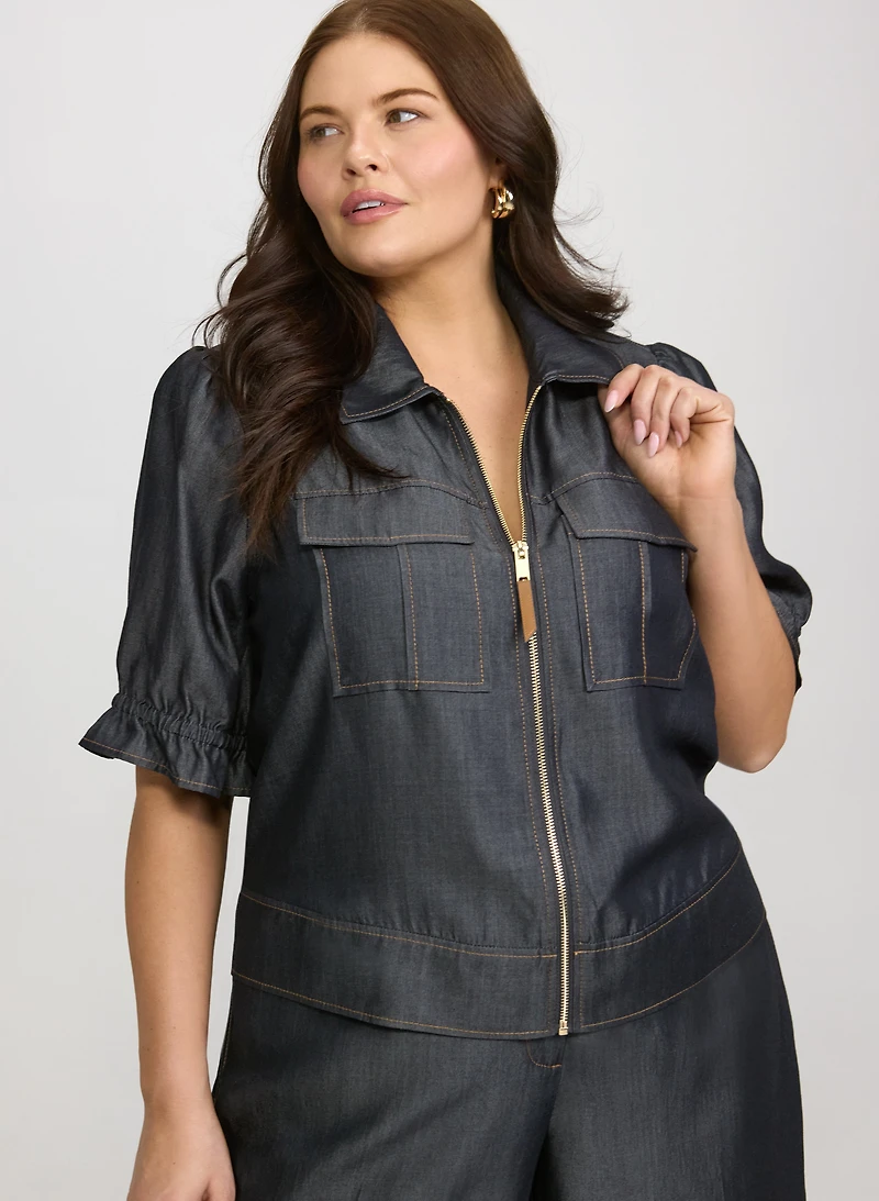Our zip-front jacket features a unique puff-sleeve design crafted from innovative tencel-denim fabric for a fashion-forward wardrobe essential. Pair it with gold-toned accessories and the matching tencel-denim pants from our collection.Shirt collarShort puff sleeve Zip-front closure Flap pockets at chestTencel-denim fabricHighest shoulder point: 24"