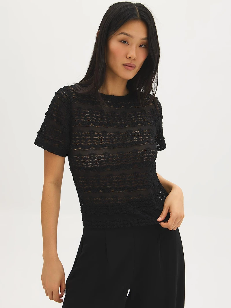 Delicate, detailed, and a little bit dreamy. This textured lace short sleeve top stands out with its 3D lace design that adds soft dimension and a touch of romance. The scalloped edges and fitted shape give it a feminine, flattering feel that's easy to dress up or down. Pair it with denim for an chic everyday look, or tuck it into a skirt when you want something a little more polished. Knit top Short sleeves Textured stripe lace Scallop bottom Sasha is 5.8" and wearing size S Fabric: 62% nylon, 37% cotton, 1% spandex Machine wash in cold water Hang to dry