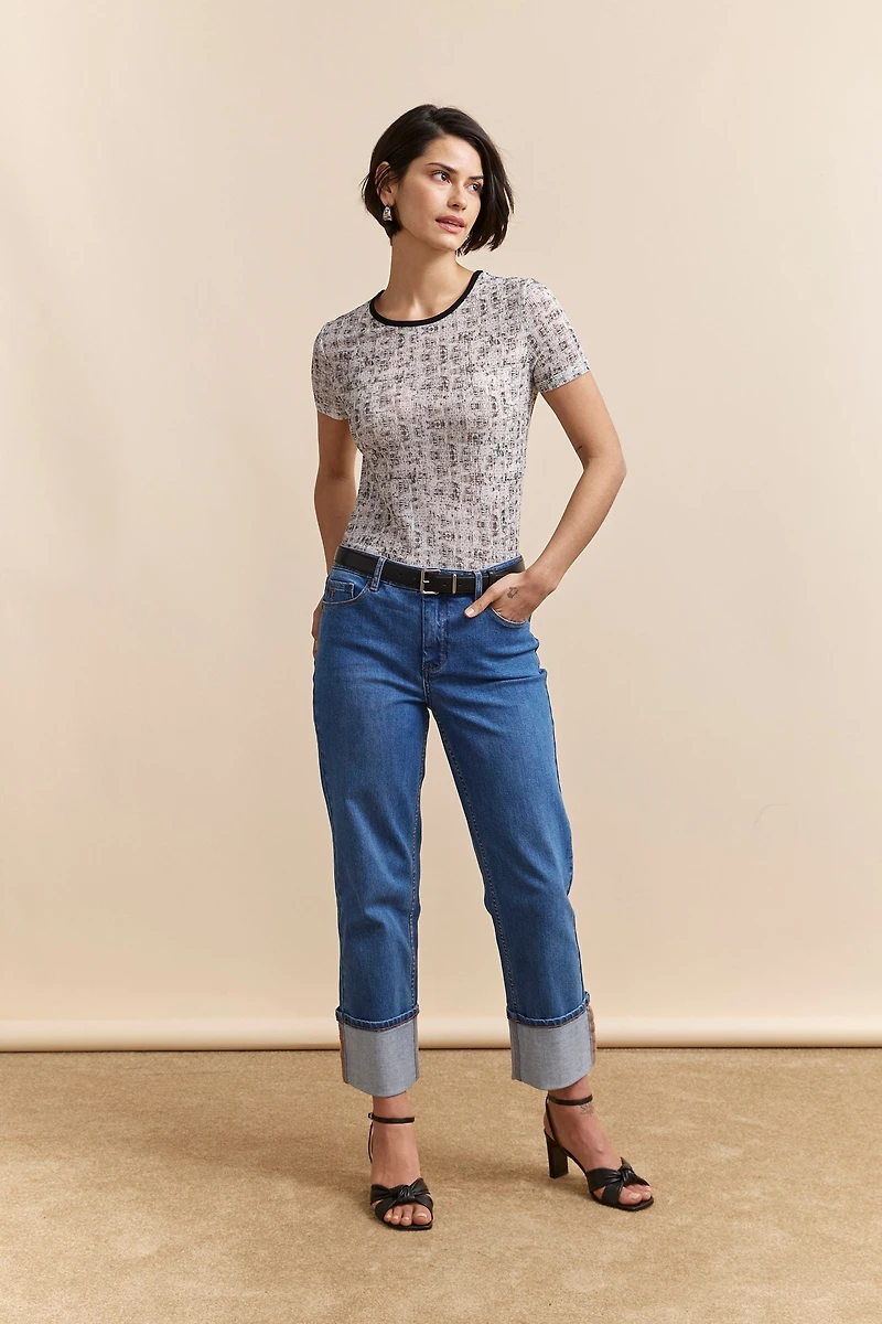 Slide into style with this textured T-shirt, boasting an intricate print that’s both eye-catching and refined. Perfect for those who value comfort and chic simplicity, its soft, breathable fabric keeps you at ease all day. Whether teamed with denim for a laid-back look or paired with a sleek skirt, this piece adapts to any setting, ensuring you stand out from the crowd with its unique texture and fitted cut.