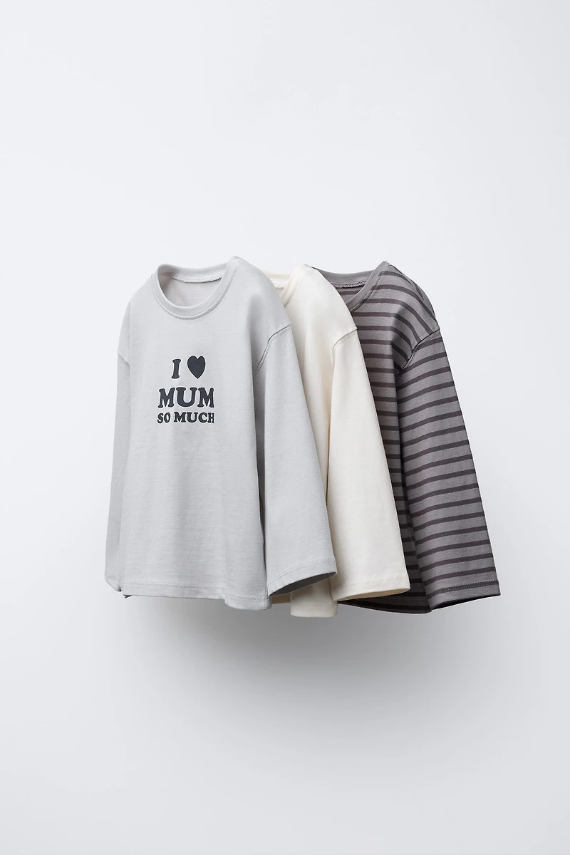 Pack of three round neck long sleeve T-shirts. Different prints. 100% cotton fabric.