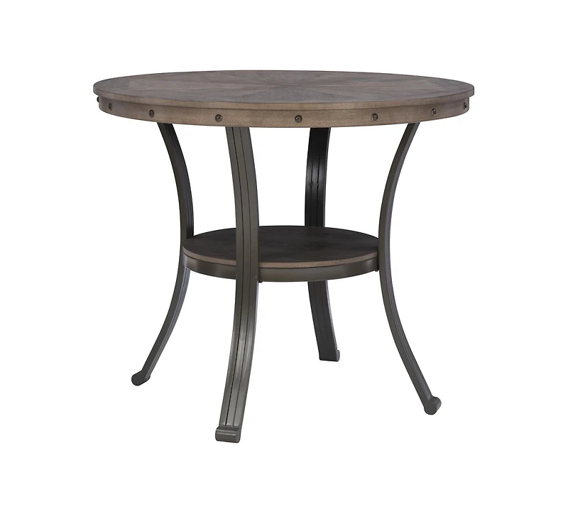 Mixing metal and wood in an updated industrial style, the Trager Counter Table provides a unique addition to your home. This round gathering height table features an inlay patterned top in ash veneer in a grey finish. Large nail heads adorn the apron. The sturdy metal base is made of curved legs in a pewter grey finish and includes a small circular shelf. Standing 36.25 inches tall, this is the perfect table to gather at or use as a casual dining solution for small space living. Matching counter height stools are available to tie the look together.