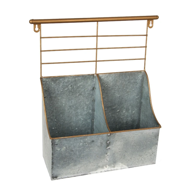 Our 2-Pocket Storage Bin is an industrial metal accessory ideal for storing little things around the house. It features 2 individual pockets on a rack where you can put stationary, kitchen supplies, silverware, or toiletries. The storage bin can be matched to other home accessories from the Farmhouse collection to decorate the interior of your home or cottage. The whole collection is made of durable metal and finished in a rustic silver to add an industrial feel to the décor.