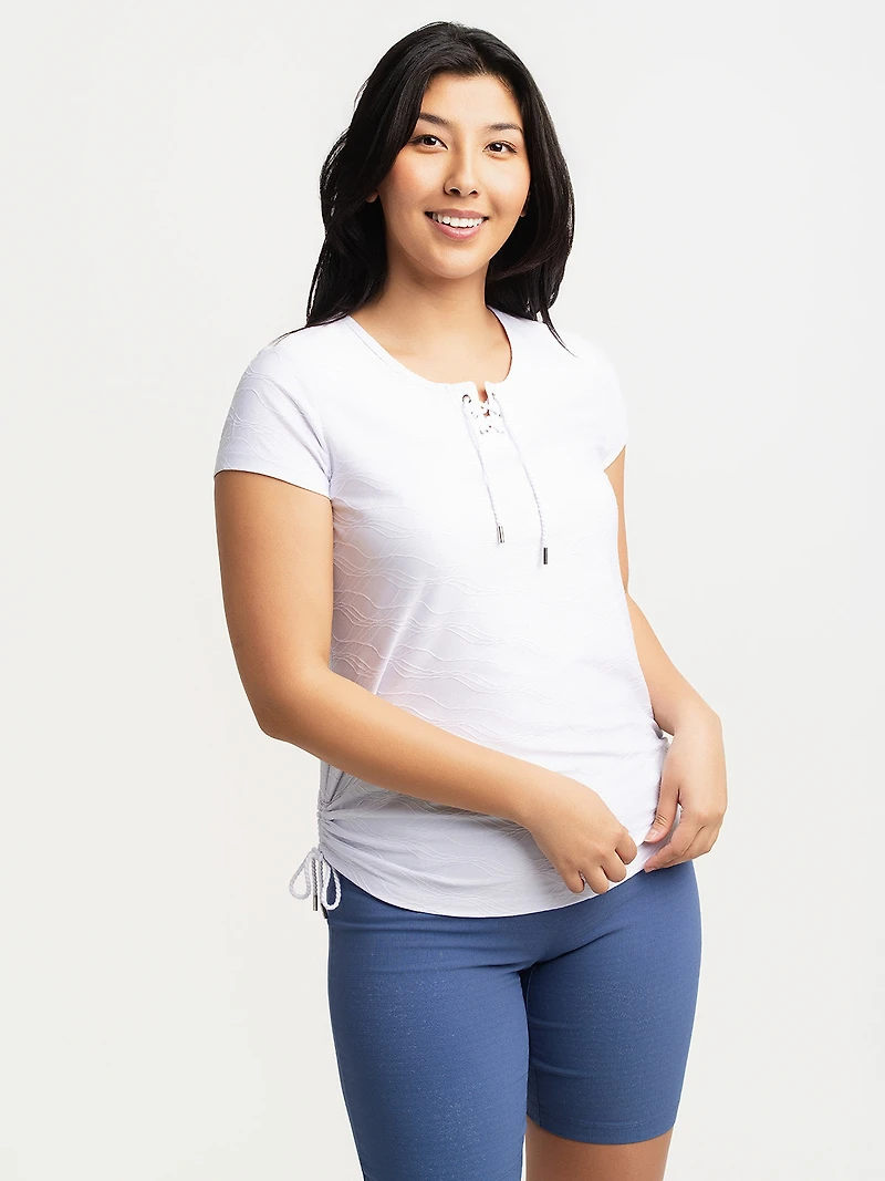 Short-sleeve t-shirt in textured knit fabric with a subtle raised pattern. It features a round split neckline with decorative lace-up detail, set-in sleeves, a rounded hem and a side drawstring at the hem for adjustable fit.