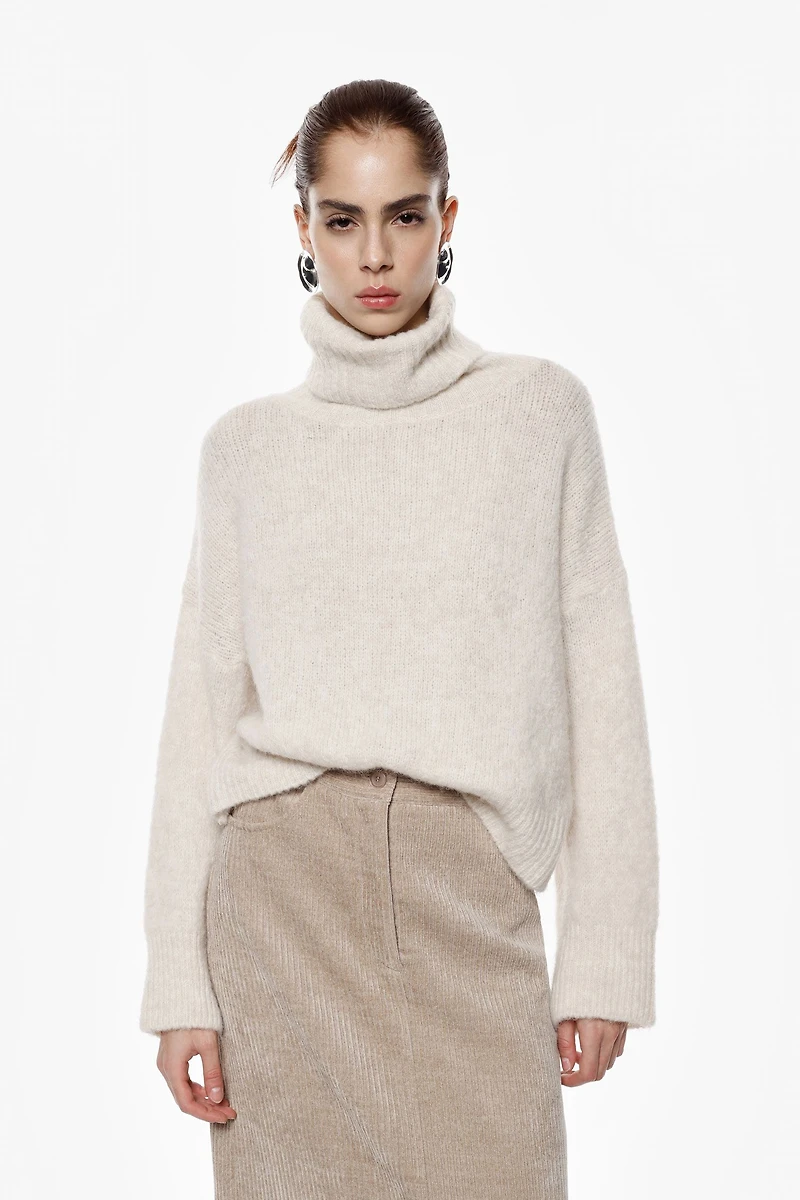 Sweater with a relaxed silhouette featuring a structured turtleneck and long sleeves. The clean lines and compact knit enhance its contemporary design, offering versatile styling for a cosmopolitan wardrobe. An ideal choice for assembling refined, original outfits with understated character.
