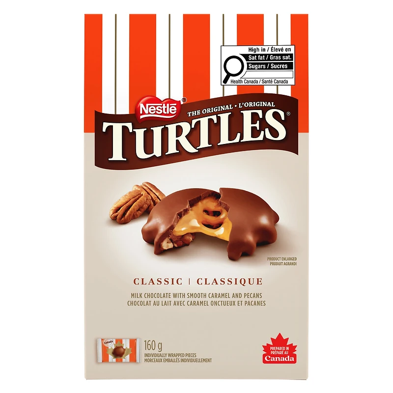Canadians just love the irresistible taste of NESTLÉ TURTLES. Continue the tradition by sharing indulgence with NESTLÉ TURTLES Classic Recipe Chocolates Share Bag. Full of individually-wrapped TURTLES pieces – perfect for sharing with those who mean the most. There’s no denying the classic recipe of smooth caramel and pecan pieces draped in rich milk chocolate. The slow pull of creamy caramel and the crunch of pecans is nothing less than pure delight. It’s no surprise this has been a beloved Canadian treat since 1949.; Make the moments last with the Canadian tradition that always has you saying, "MMM...I LOVE TURTLES!".