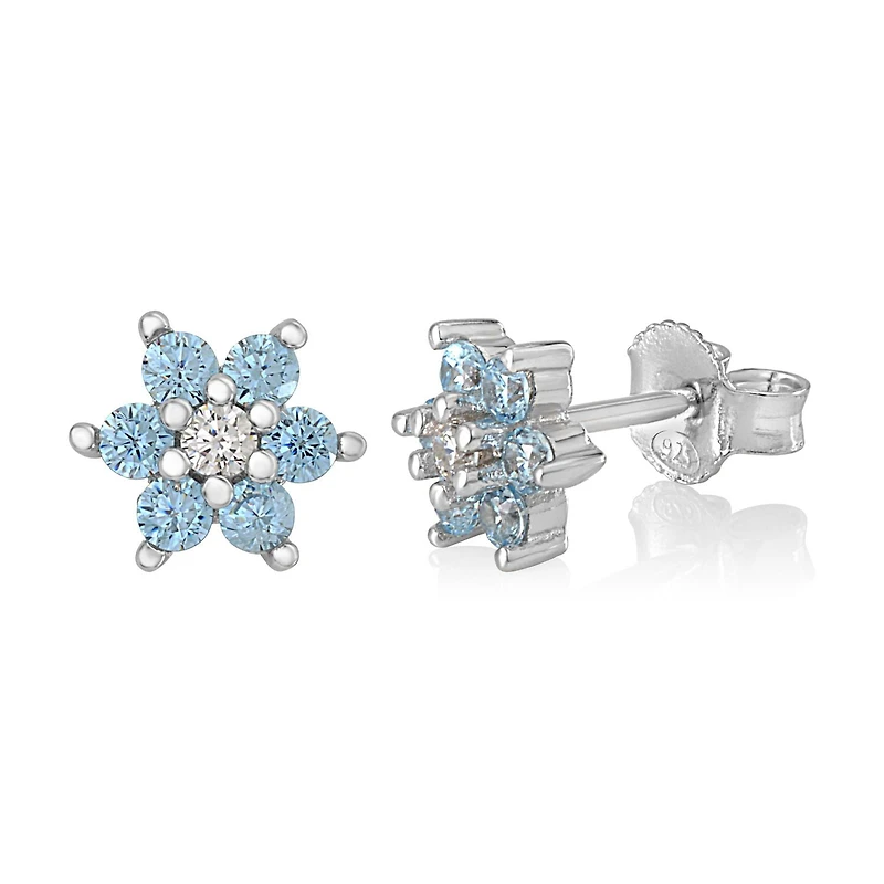 Unicornj Childrens Sterling Silver 925 Light Blue CZ 6 Petal Flower March Birth Month Stud Post Earrings