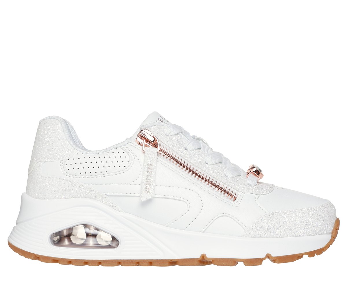 Sparkle with every cushioned step wearing Skechers Street™ UNO Gen1 - Gem Style. This lace-up Skechers adaptive closure design features a synthetic upper with glittery overlays, a quarter zip closure, a Skechers Air-Cooled Memory Foam® comfort insole, and a visible Skech-Air® airbag midsole.
