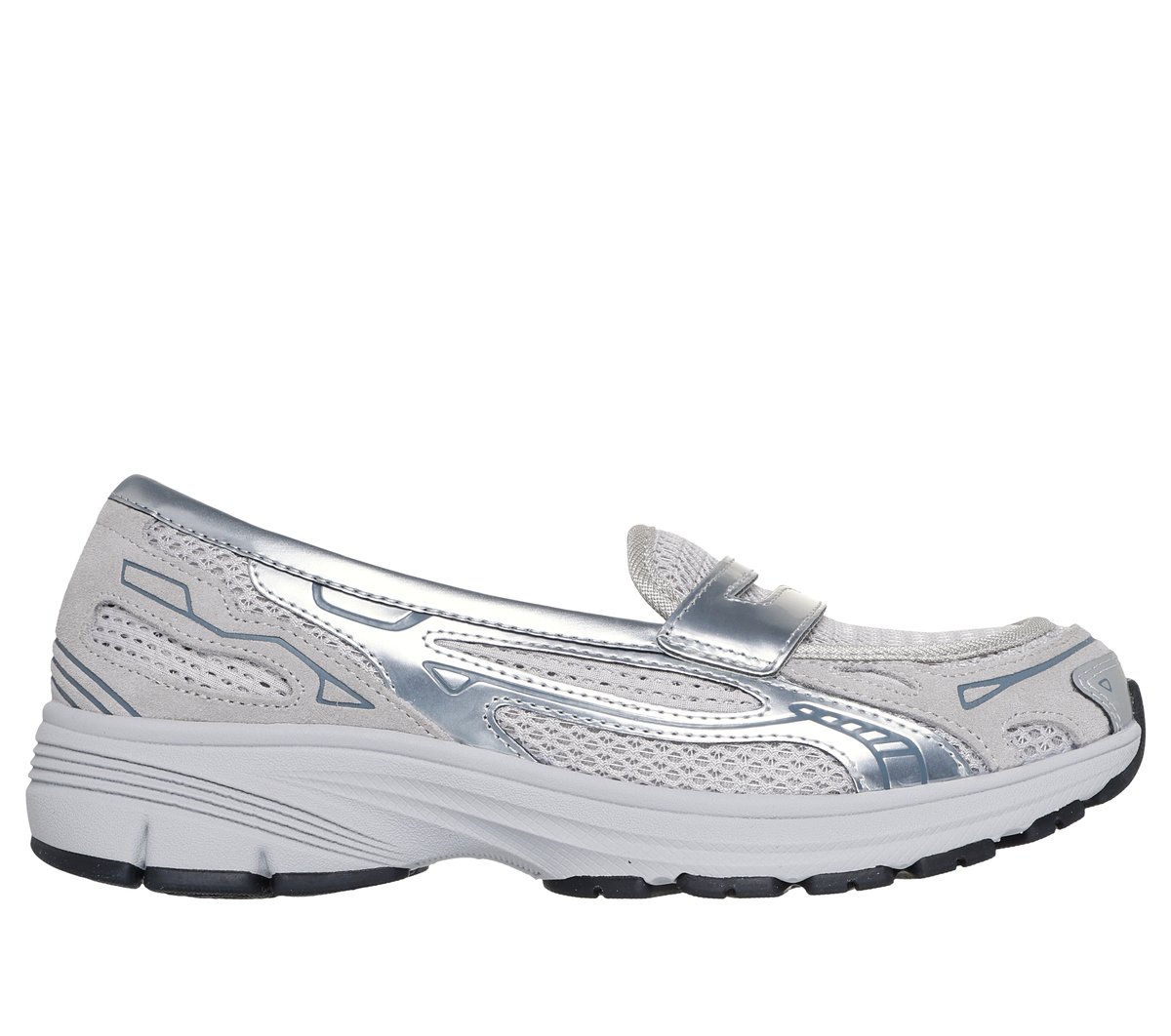 Let your sporty side shine in casual comfort with Skechers Var-City. This easy-on vegan loafer features a mesh and duraleather upper with metallic accents and a Skechers Air-Cooled Memory Foam® insole.