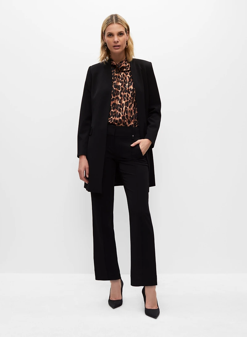 A vegan leather trim adds just the right amount of edge to our chic redingote. Style this sleek silhouette with a tailored pair of trousers.