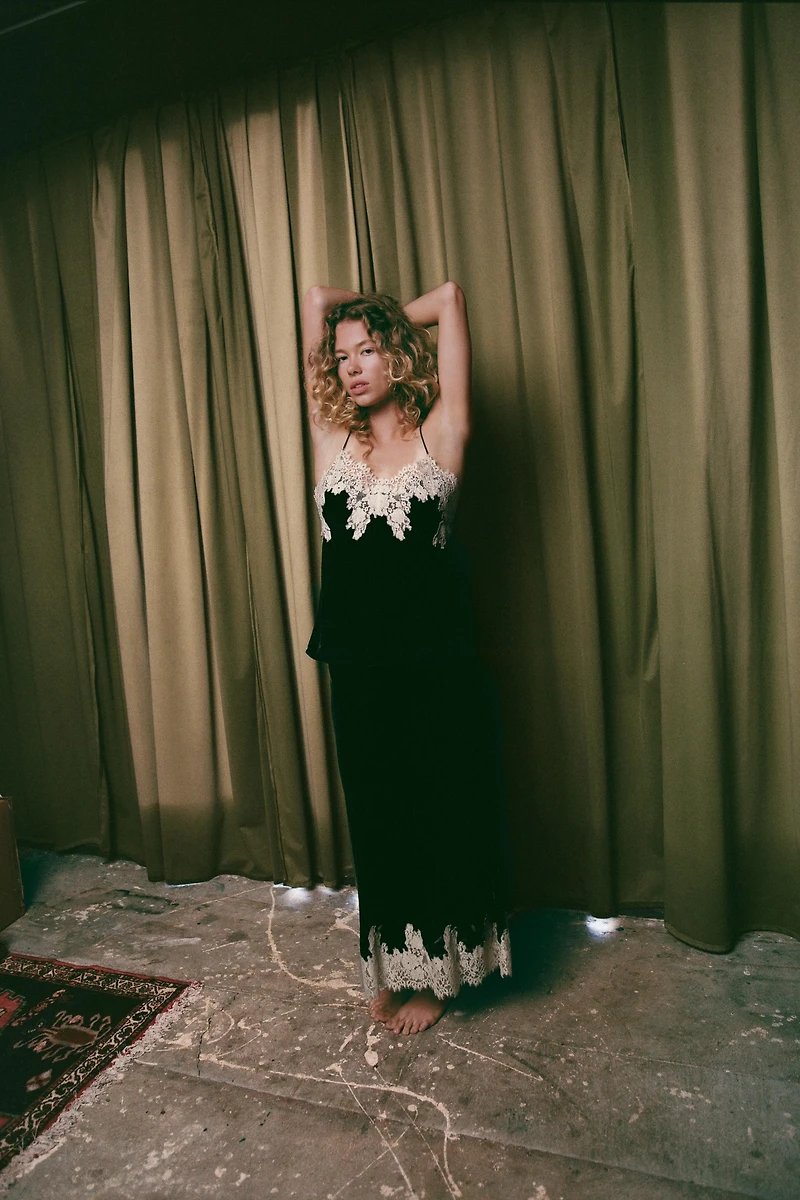 Velvet fabric top. V-neck and spaghetti straps. Contrasting lace appliqué detail.