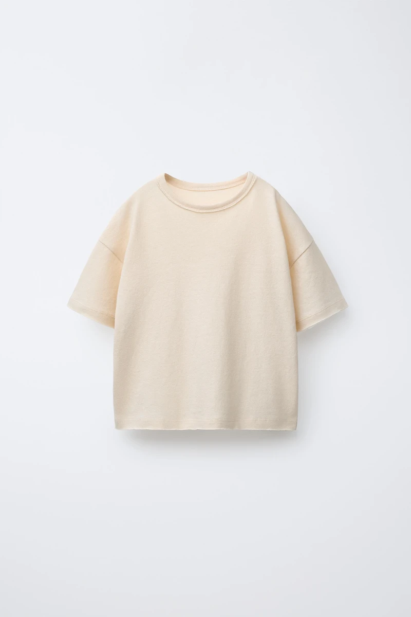 Washed effect T-shirt with round neck and short sleeves. Fabric with 50% cotton and 50% linen.