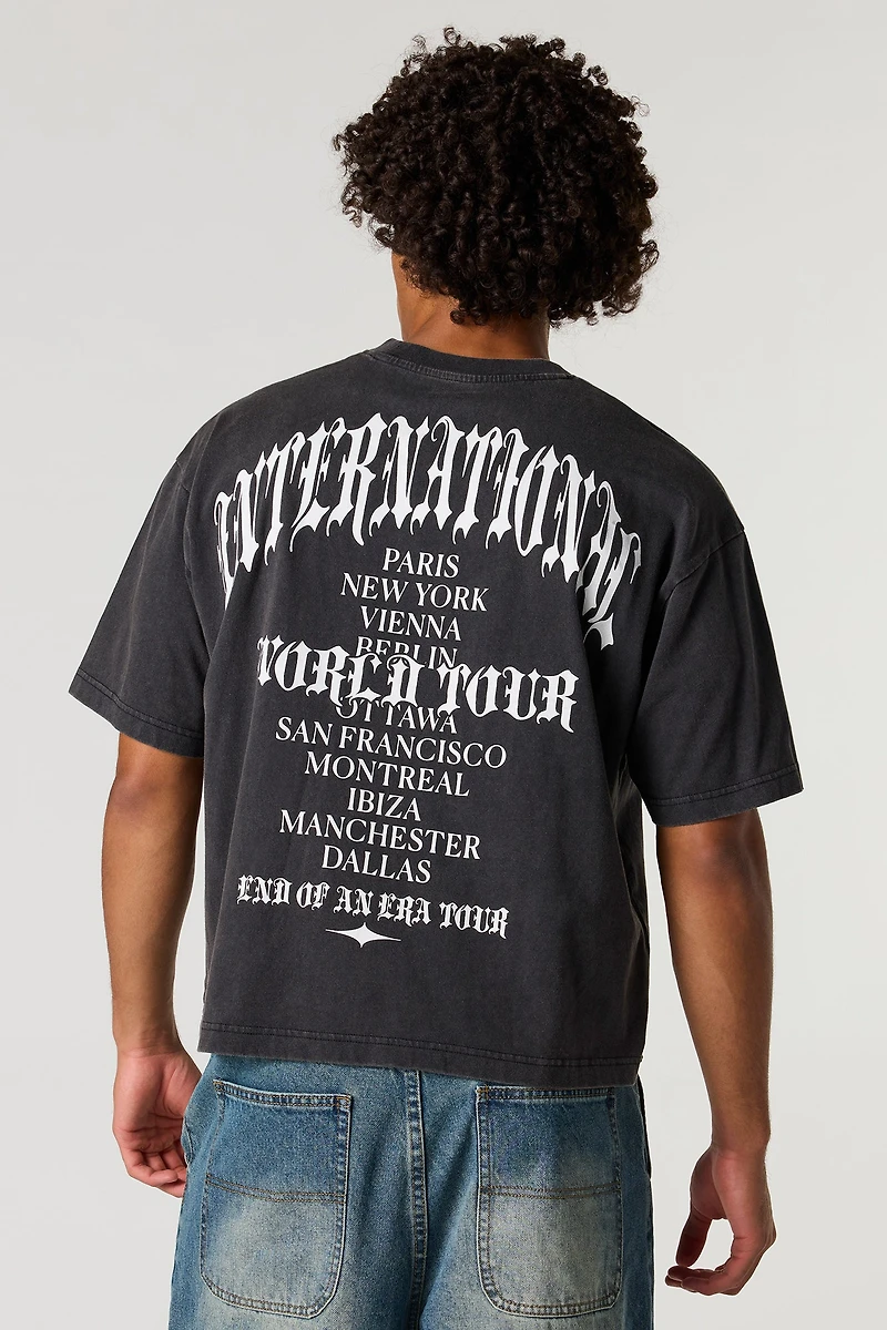 This top features boxy fit, washed material, graphic front & back, crew neckline, and short sleeves.