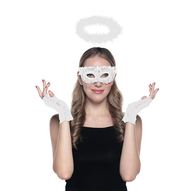Not all us will go straight to hell, some of us belong in heaven. Show some good souls the gates of heaven with this cute and sexy White Angel three piece set featuring a pair of whit lace glovelettes, a white lace pointy mask and a white faux fur halo headband for the perfect Halloween night.