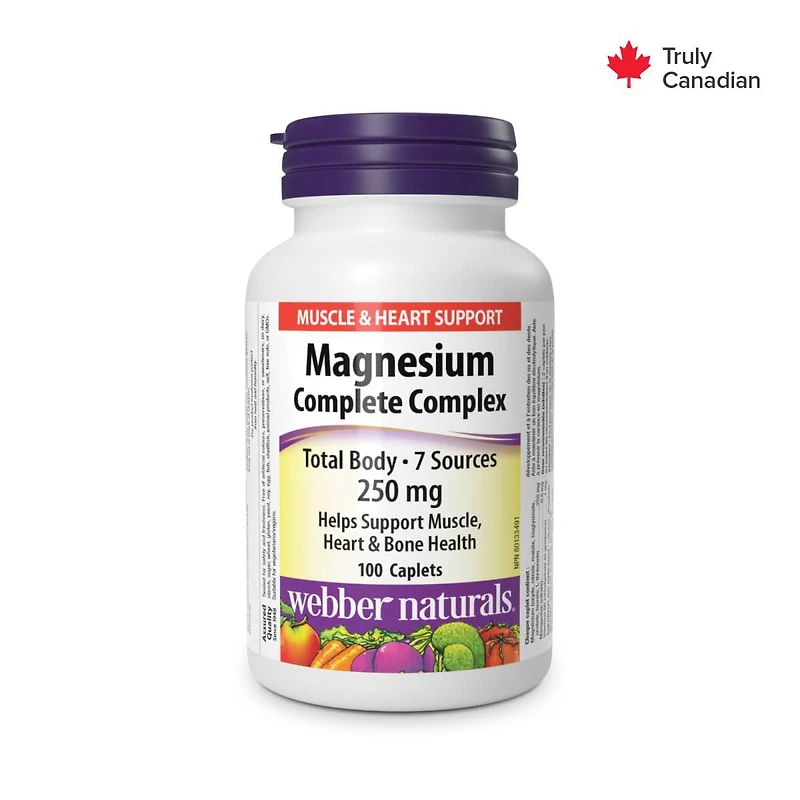 Magnesium Complete Complex from Webber Naturals provides seven sources of magnesium to help maintain proper muscle function, including the heart muscle, and to support the development and maintenance of bones and teeth. Magnesium is also important for producing adenosine triphosphate (ATP), the body’s main energy molecule.This formula features highly bioavailable magnesium bound to organic acids, including magnesium malate, orotate, taurate, L-threonine, and bisglycinate. These forms of magnesium play different roles in the body, supporting a wider range of activities to promote good health. Manganese and vitamin B6 round out the complex to facilitate magnesium absorption and proper use by the body, better allowing magnesium to support cardiovascular and bone health.Magnesium Complete Complex from Webber Naturals is a convenient two-per-day formula that offers muscle and bone support, especially for adults with low stomach acid or other digestive concerns. These easy-to-swallow caplets are non-GMO and suitable for vegetarians and vegans.