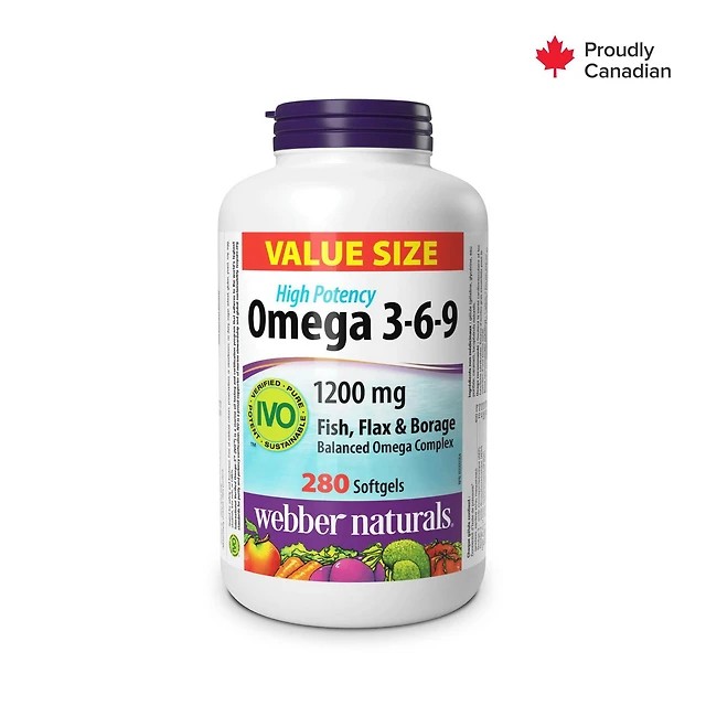 Webber Naturals® Omega 3-6-9 High Potency Fish, Flax & Borage 1200 mg, Supports Heart and Mind, 280 Softgels