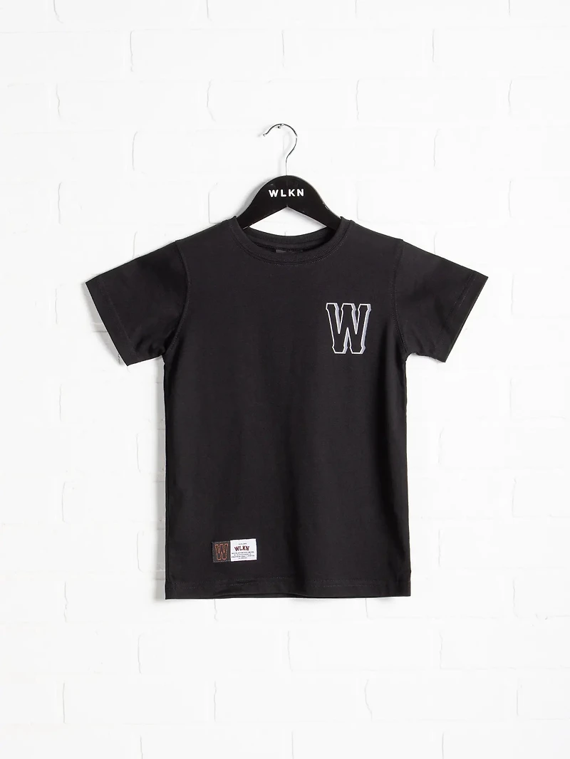 A junior t-shirt with a distinct varsity style, featuring a printed "W" on the chest and the WLKN logo in collegiate lettering on the back. Its classic black look and regular fit make it an essential item that's easy to pair with joggers or shorts for a streetwear style from a young age.