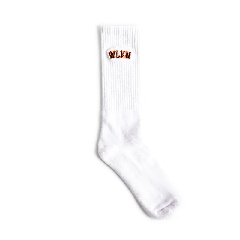Elevate your streetwear looks with the Major socks, featuring the embroidered WLKN logo in a bow on the leg. A white ribbed crew-knit essential that pairs perfectly with your favorite sneakers or sandals for a relaxed look.