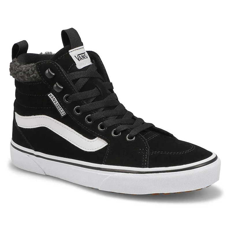 Lend a trendy yet comfortable upgrade to your go-to looks with the Filmore Hi Vanguard black/ white sneaker from Vans. Created with water-resistant canvas and suede upper for longevity, these high-top skate-inspired sneakers have a classic round toe front, secure lace-up panel with metallic eyelets, cushioned collar panel with stitch accents, side signature label branding, pull-tabs at collar and tongue for easy access, cushioned comfort footbed, and a chunky rubber outsole for excellent traction.