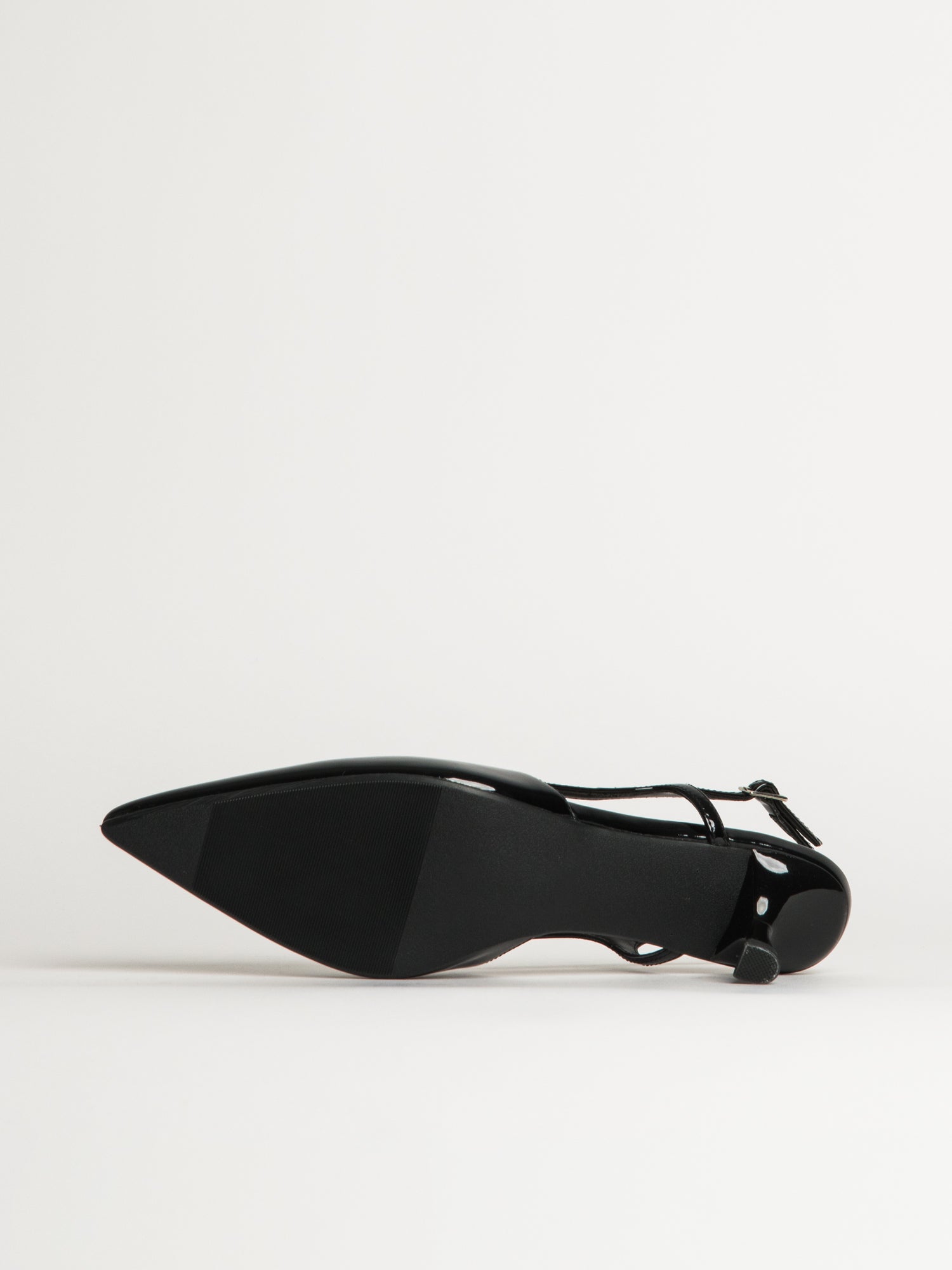 - Sling back kitten heel- Pointed toe- Faux patent leather - Heel strap with buckle - Heel height 2.25"- Black colourway