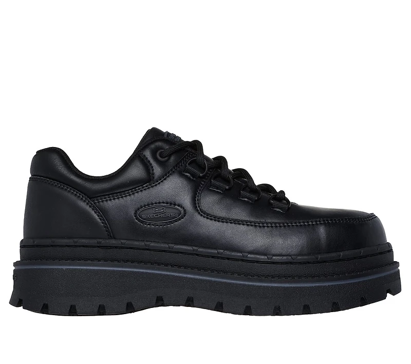 A favorite style arrives in comfort and safety with Skechers Work™: Jammers SR - Tepin. This slip-resistant lace-up platform sneaker features a leather and synthetic upper with a cushioned Skechers Air-Cooled Memory Foam® insole and carbon nano safety toe (non-CSA approved).