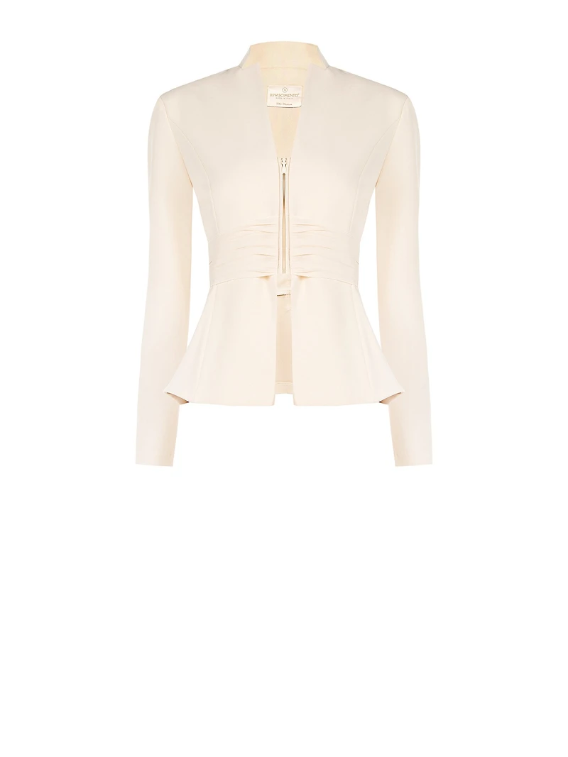 A structured long sleeve jacket designed with a clean V neckline and a sleek front zipper closure. The fitted bodice is accentuated by subtle pleating at the waist, creating a flattering, cinched silhouette that flares into a refined peplum hem. Tailored lines and a smooth finish make it a polished piece perfect for elevated daywear or sophisticated evening styling.