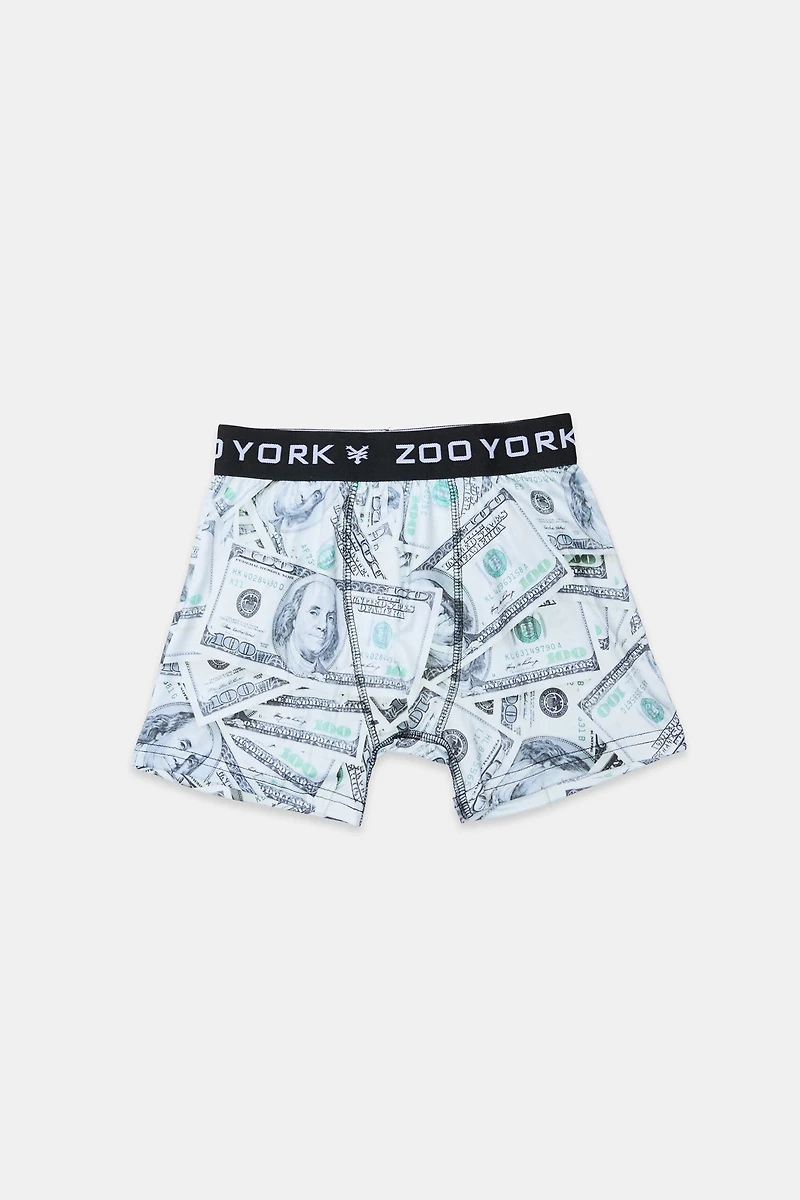 Boxer brief with allover money printElastic waistband with Zoo York logosLonger length90% Polyester, 10% SpandexMachine wash cold water - Gentle with like colours - No bleach - Hang to dry - Do not ironImported by Zoo YorkStyle #2949-19122501